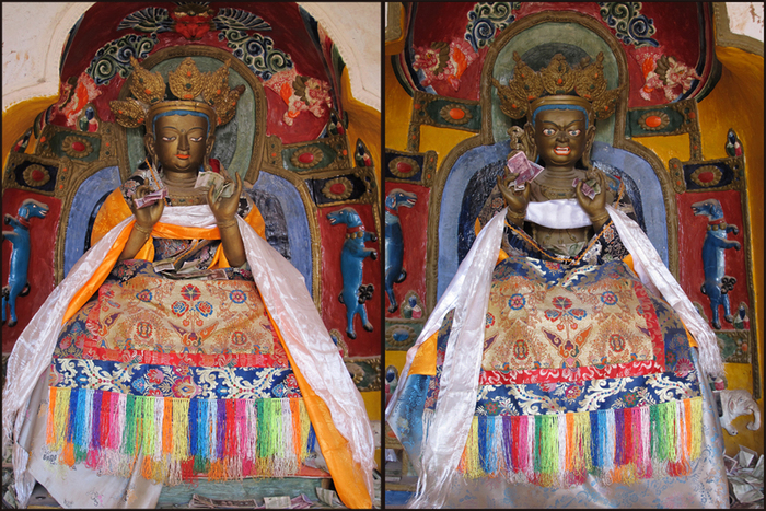 Кроме ленточек и благовоний Буддам часто оставляют деньги. Суют прямо в руки )