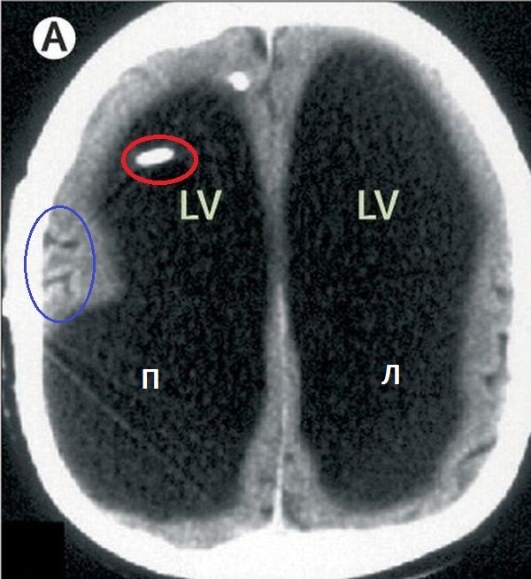Снимок А: Это КТ-картина головного мозга (аксиальный снимок). LV-боковые желудочки, правый и левый. Красным отмечен вентрикулярный конец шунта. Синим извилины головного мозга, опосредовано это нам говорит об отсутствии отека головного мозга и компенсации процесса.