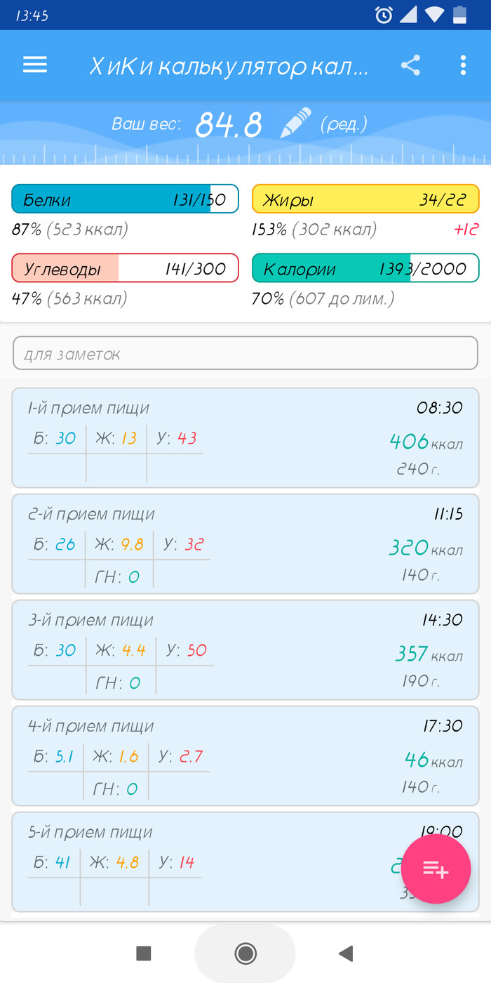 Соотношение пищи. Про баланс питания можно спорить бесконечно. Я же выбрал для себя соотношение БЖУ (белки-жиры-углеводы) 30/10/60. Скачал самый простой калькулятор калорий, и старался держать пропорцию.