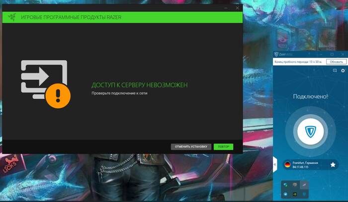 пользуюсь несколькими устройствами Razer, все было хорошо горя не знал, вчера выбило с аккаунта в приложении и никаким образом не позволяло подключиться обратно, было вот такое окно, то есть само приложение просит залогититься, но при этом окно ввода логина и пароля не появляется, думаю ну не беда, попробуем через VPN, вот только нифига не работает, стал грешить на глюк софта, удалил, а установить все низя, поздно, надо было раньше думать, через VPN все равно пишет, что сервера недоступны, перепробовал много разных стран, нифига.