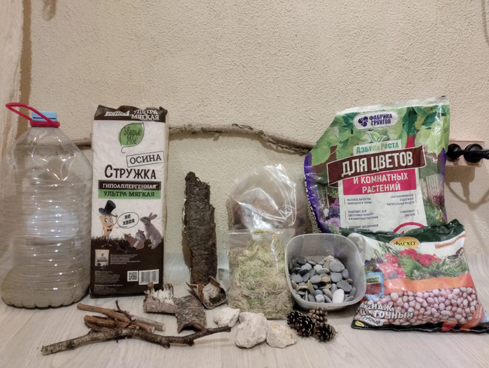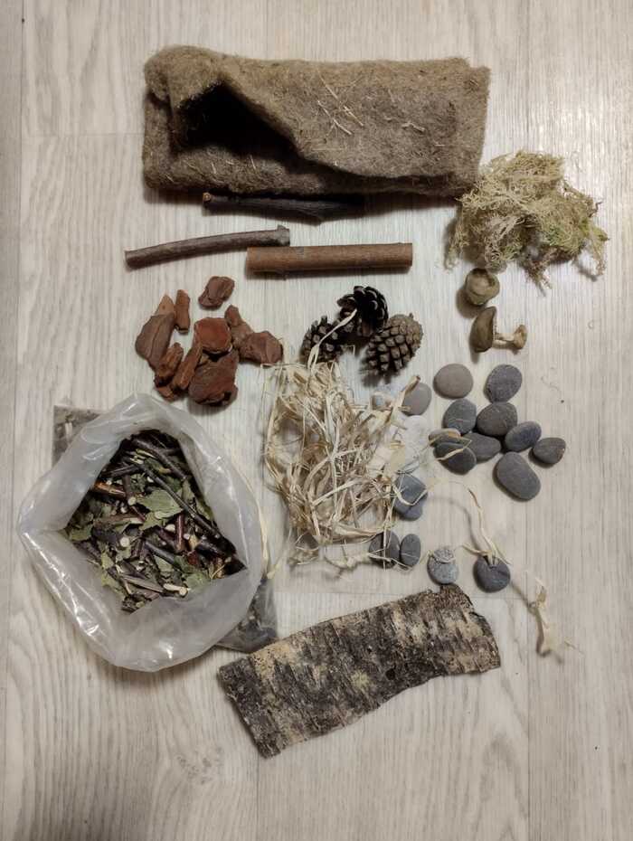 Эти природные материалы я использую в том числе для домиков мышей и жуков. А в горшке, который когда-то служил укрытием для землероек, теперь живёт ребёнок бальзамина