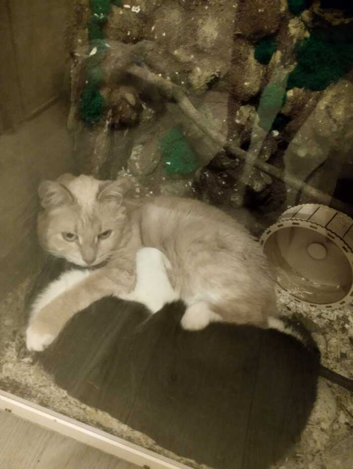 А таким он был после прощания с землеройками. Эта фотография сохранилась только благодаря двум наглым мордам, которых вы видите внутри вольера. Но на этом изображении заметны декоративные элементы конструкции: рельефная коричневая стена, украшенная искусственным мхом, ветка, кора и колесо. Очень жаль, что мне в своё время не пришло в голову сделать качественные фото вольера: он был красивым.