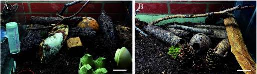 Землероек содержали в пластиковых контейнерах и стеклянных террариумах с плотно закрывающейся крышкой с вставками из стальной сетки для вентиляции. Для животных было создано множество укрытий. Использовались различные варианты декора: дерево, кора, глиняные горшки, шишки, мох, кокосовая скорлупа. Подстилкой служила смесь почвы и песка. Добавление древесной подстилки нежелательно, так как землеройки могут пораниться о щепки и опилки. Я же подмешала в подстилку осиновую стружку, что, вероятно, было ошибкой. Но стружка – это не опилки, она мягкая, пораниться о неё сложно.