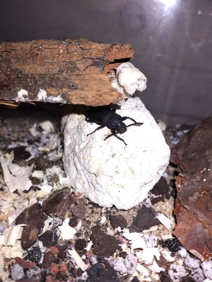 А дальше началась уже другая история. После того, как землеройки вернулись в лес, я решила очистить вольер. С ужасом я обнаружила, что бывшие питомцы долгое время бессовестно меня обманывали: они съели не всех зофобасов. Личинки умудрились сбежать от ленивых хищников и спрятаться в разных щелях. Но это ещё полбеды. Как оказалось, они прогрызли ходы в монтажной пене, и могли быть где угодно внутри неё. Бесконтрольное распространение жуков в доме не входило в мои планы. Пришлось отодрать всю монтажную пену (было очень жалко портить результат своего труда). Но я нашла всех личинок - они сожрали монтажную пену и жили в ней. Но и это ещё не всё. В одной из щелей меня ждал сюрприз - взрослый чёрный жук, который сидел там как ни в чём не бывало и шевелил своими усами, нагло глядя мне в глаза. Продолжение вам известно. Так мой некогда красивый вольер превратился в не очень эстетичное зрелище.
