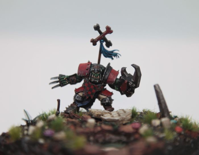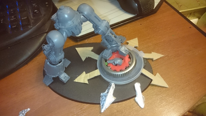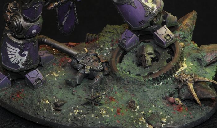 Крашу я очень редко, поэтому в данную модельку я запихал все что только можно. Точнее на подставку. Вы можете наблюдать на ней самодельную гайку от болгарки, трубочку для питья, стрелки из фольги и даже колесико от зажигалки. Позади модельки видно небольшую лужу из эпоксидки. Белые и красные растения из пропущенного через тёрку поролона. Подаренный другом рыцарь уже несколько лет ждал когда же я овладею фрихэндами. Такие большие пустые поверхности, как иначе? Но нет. Все что вы видите на модели, это совсем немного доработанные декали из оригинального набора. Так же я на геральдическом щитке можно приметить вылепленные из "зеленки" черепки. Для того, чтобы разбавить статичность изначальной позы на оружие приклеил "развевающиеся" цепи.
