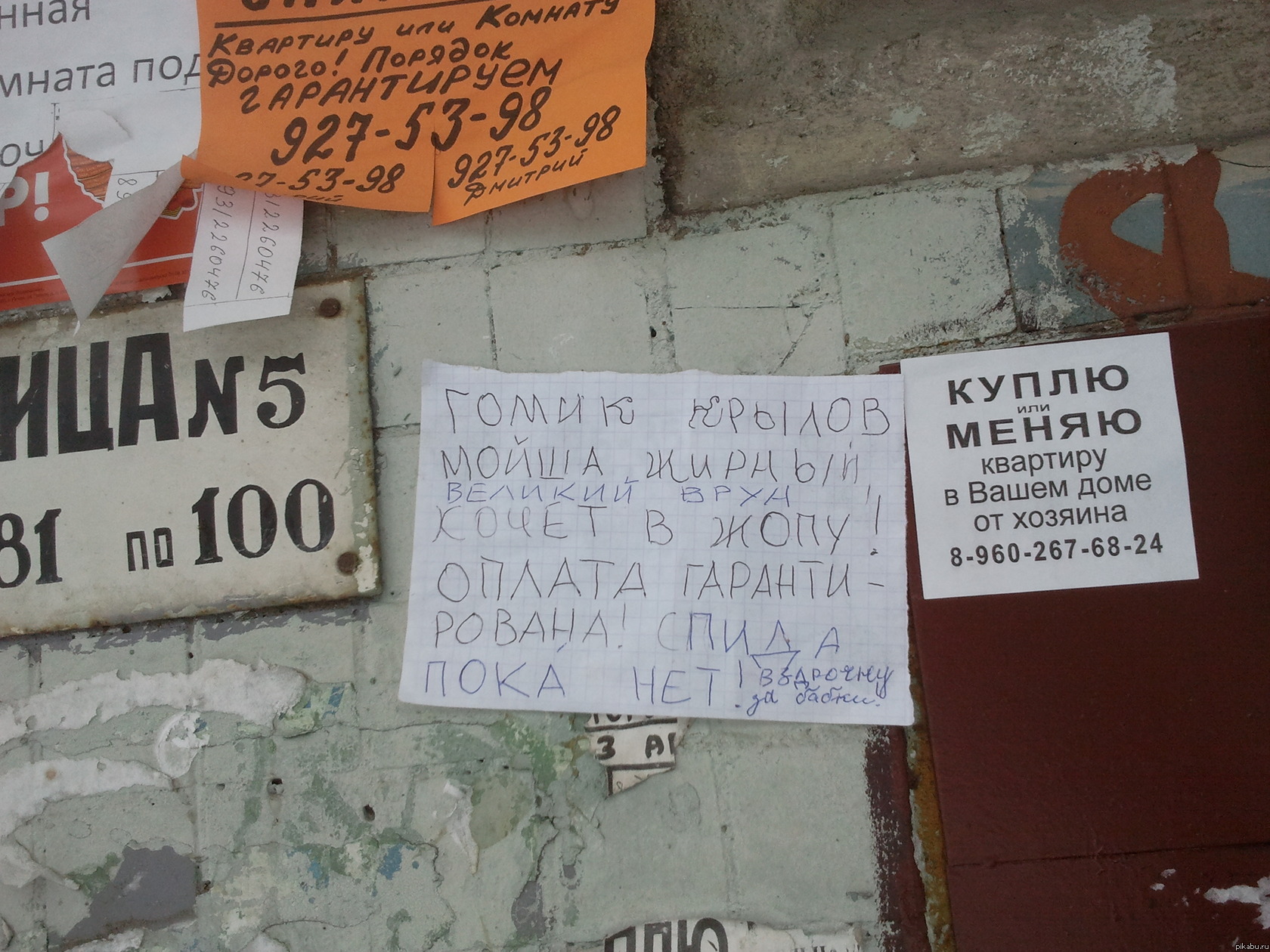 Furial 13 лет назад Объявление на дверях подъезда Сегодня с утра стою у подъезда, достаю ключи и заодно рассматриваю объявления(вдруг что-то важное). Интересно, кого же этот Крылов так разозлил? [моё] Другое