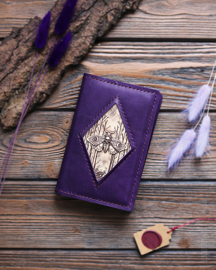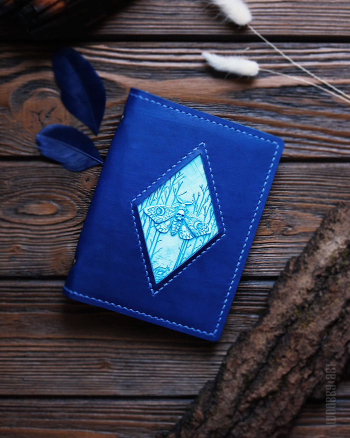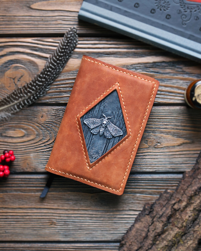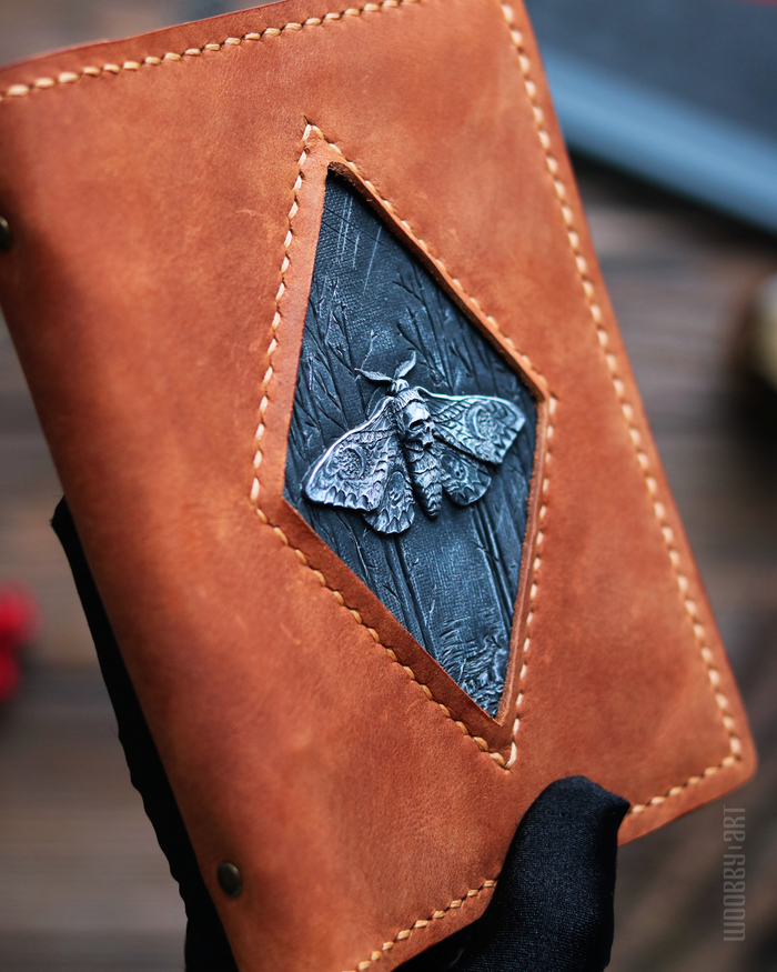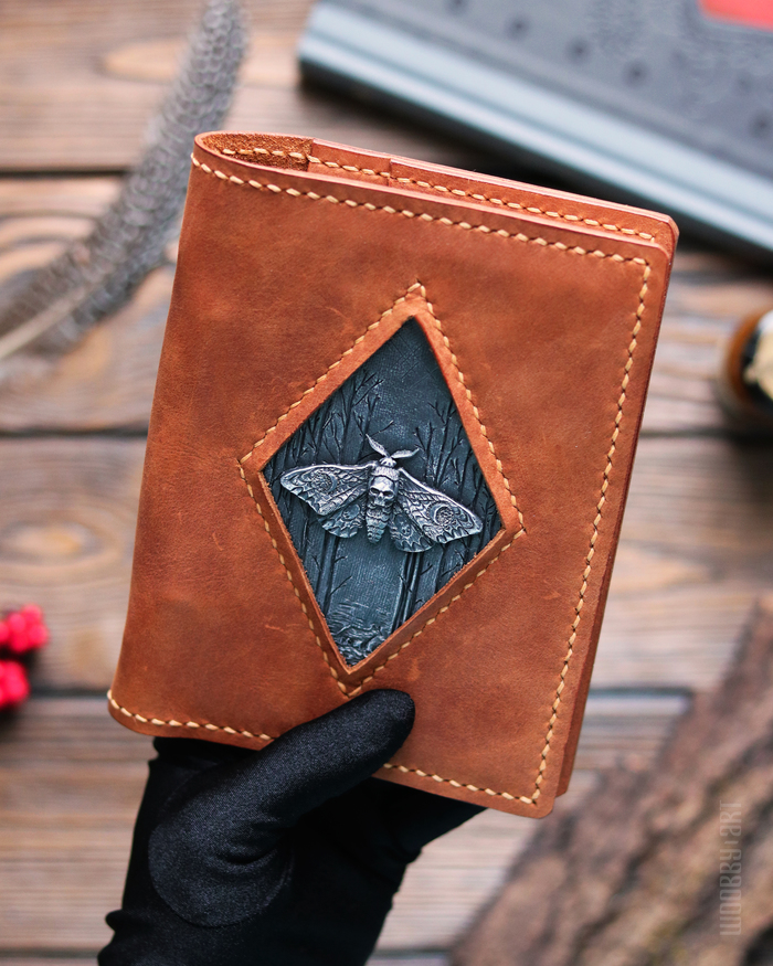 Недавно сделали вот такую серию под названием "Тишина". Бабочка мертвая голова на фоне зимнего леса. Обложка шьется из кожи краст или крейзи хорс. Вставка - традиционная лепка из запекаемых полимерных глин, формовка и отливка уже из высокопрочного полиуретанового пластика.