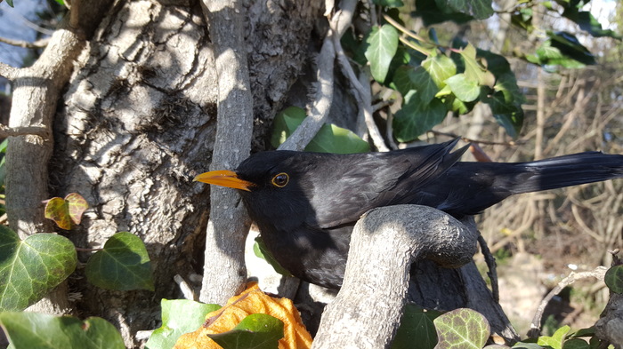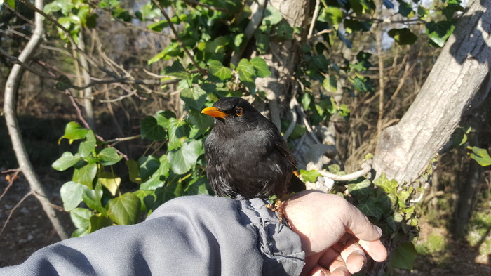 Ставили сегодня в Лесу в домике окна, доставили, собрались уходить, собрали инструмент, думаю пробегусь по всему дому не забыли ли чего, поднялся на второй этаж, а там в луже сидит какой-то черный комок с желтым клювом... Видимо залетел пока мы ставили и когда хотел покинуть дом на полном ходу в стеклопакет жахнулся, ну я его взял вытер он дупля не отбивал, взял пирожок думал покормить он ноль. Посадил его на дерево.