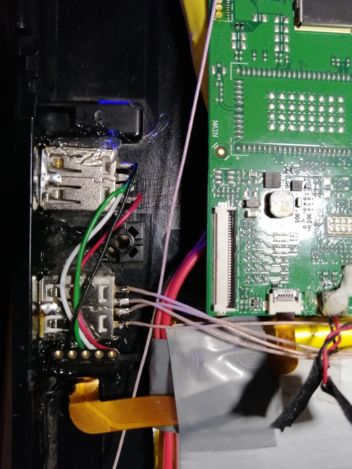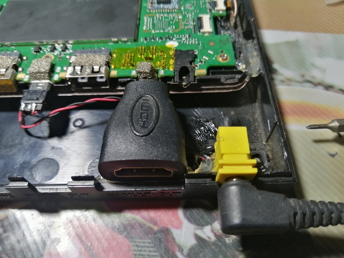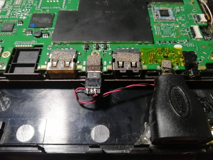 первым делом подключил питание и начал прикидывать hdmi разьем, чтоб перекрыть все родные отверстия в корпусе, прикинул, временно прихватил термоклеем.