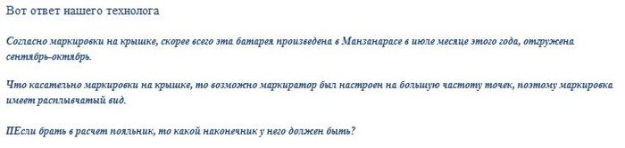 В ответ на что я на попавшемся под руку куске пластика нанес паяльником серийник (по мне, так вышло даже ровнее, чем на батарее) и отправил им. также отправил им видео того, как работает маркировочная машина, чтобы убрать последние сомнения в способе нанесения серийника (как оказалось довольно занятный прибор - https://youtu.be/nauT6w_OQYQ )