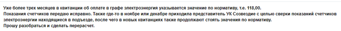 Всем привет! Собираюсь переехать в другую квартиру, пока в ней не живу, но коммуналку приходится оплачивать. И вот заметил я такую хрень, что из управляшки приходят счета, в которых в графе электроэнергия указывается значение по нормативу, что гораздо больше реально потребляемой энергии. Решил написать об этом факте жалобу через ГИС ЖКХ.