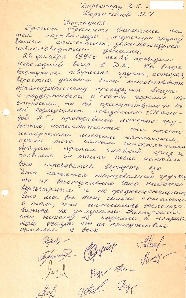 «Докладная. Просим обратить внимание на так называемую творческую группу Вашего коллектива, занимающуюся неблаговидными делами. 26.12.1991 цех 26 проводил новогодний вечер в ДК. На вечере выступала творческая группа, которая, вероятно, должна была способствовать организованному проведению вечер и поддерживать у гостей хорошее настроение, но все присутствующие были возмущены поведением товарища Ивановой, проводившей лотерею: грубостью, нетактичностью она просто испортила многим настроение, кроме того самым непостижимым образом пропал главный приз и появился он только после настойчивого требования вернуть его. Что касается танцевальной группы, то их выступление было настолько вульгарным и непрофессиональным, что мы все очень сильно пожалели о том, что согласились воспользоваться их услугами. Настроение они никому не подняли, а неприятный осадок от их выступления остался у всех.»