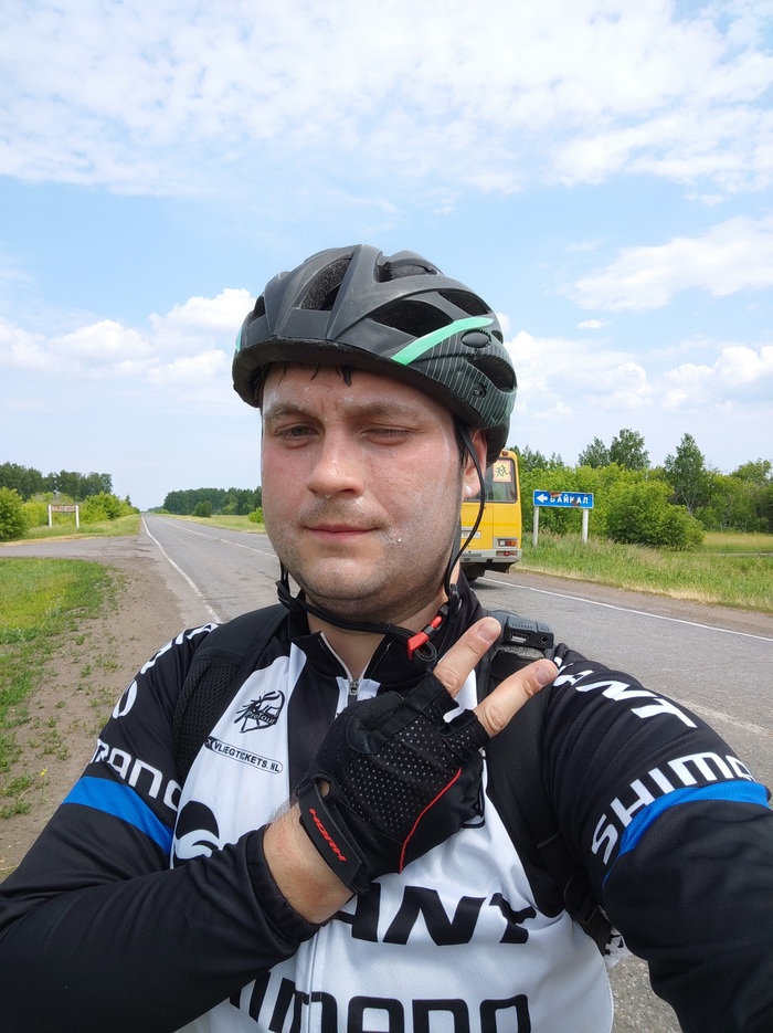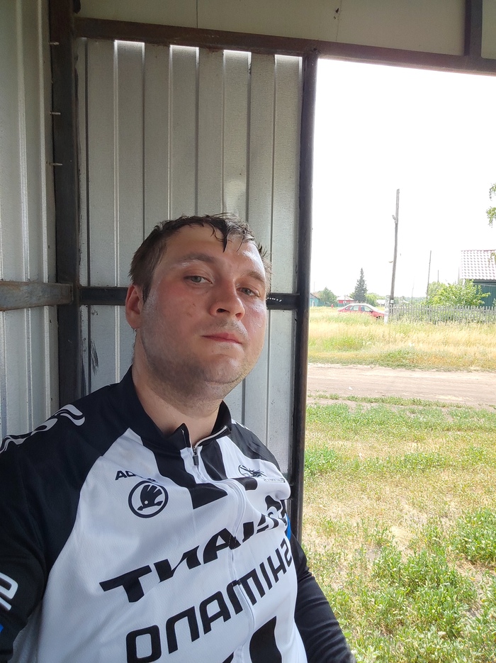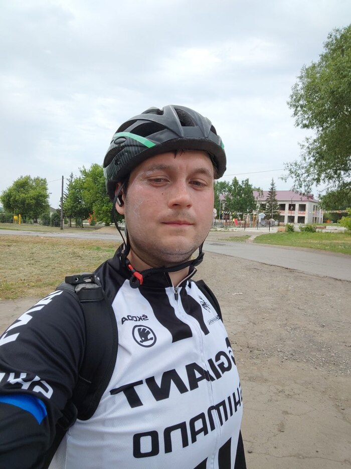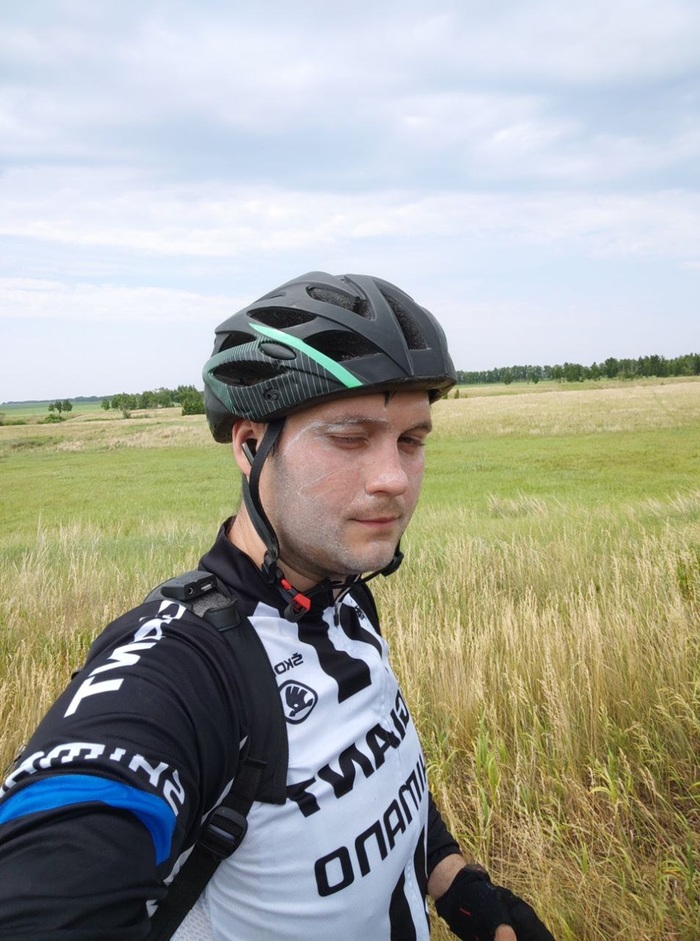 Лицо покрыто толстым слоем крема от загара. Сибирское солнце - беспощадно, даже такого слоя оказалось мало, я подгорел. Не смотрите на облачность, она переменная и ничуть не спасала, судя по велокомпу на улице 30+ всегда