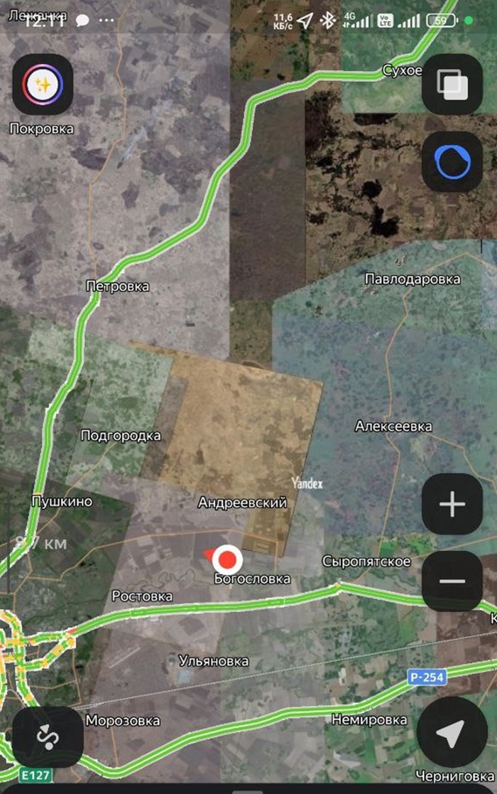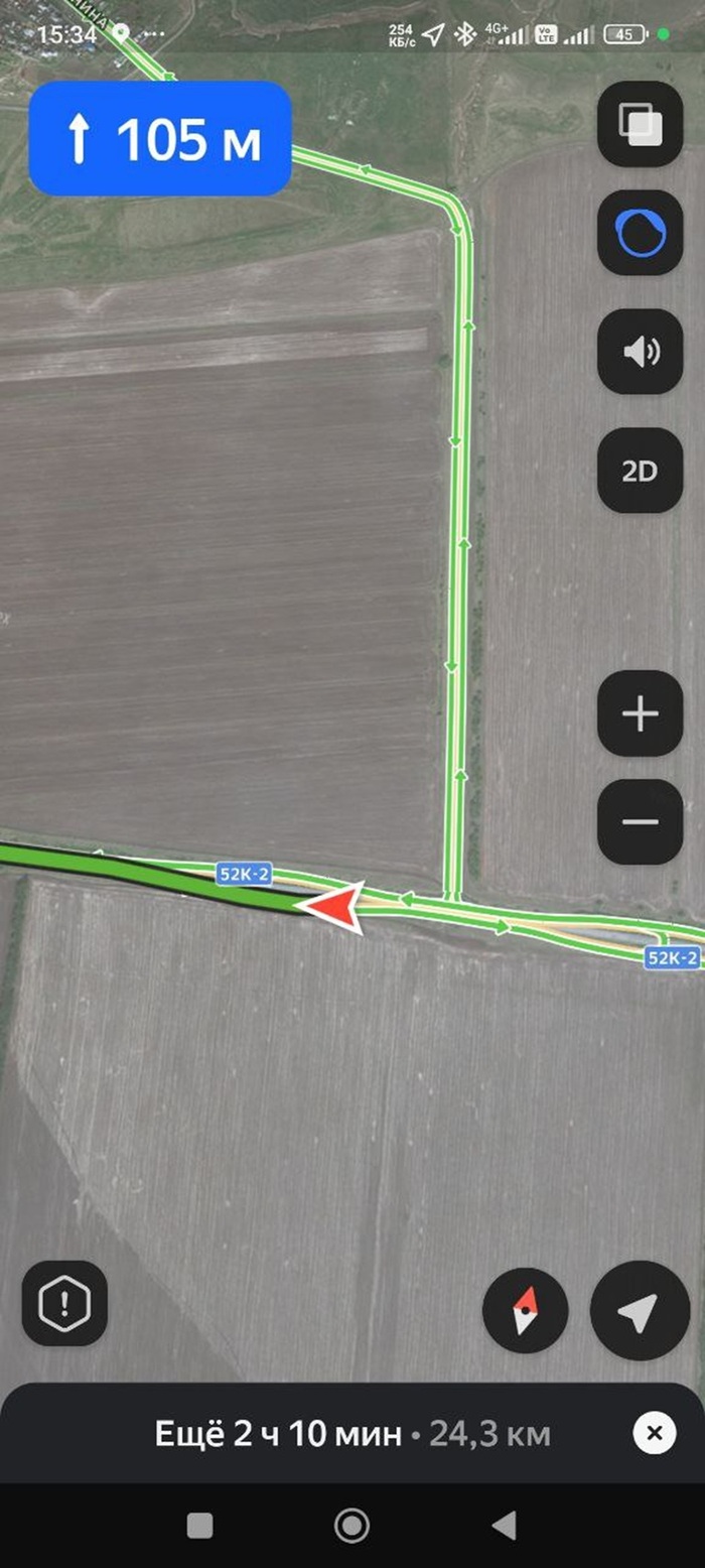 При этом навигатор яндекса немножко пиздит и уговаривает дать круг, хотя между точками 3 и 4 есть отличная, полевая дорога.