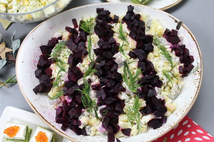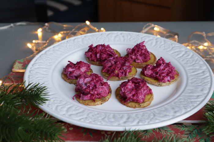 Раскладываем картофель на блюдо, а сверху ложку салата из свеклы и сельди. Так же можно украсить укропом или луком.