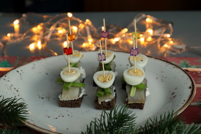 Канапе с селедкой и перепелиным яйцом.