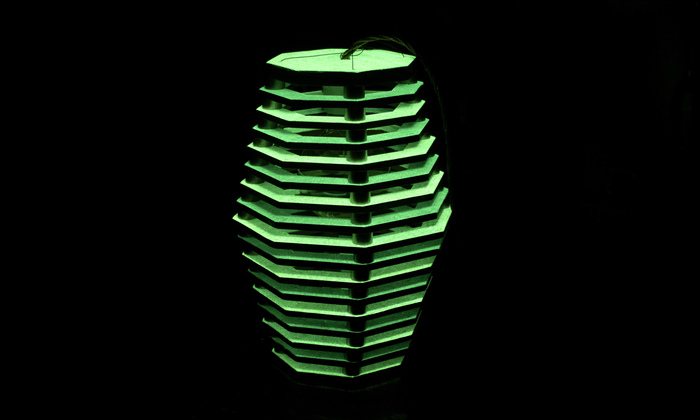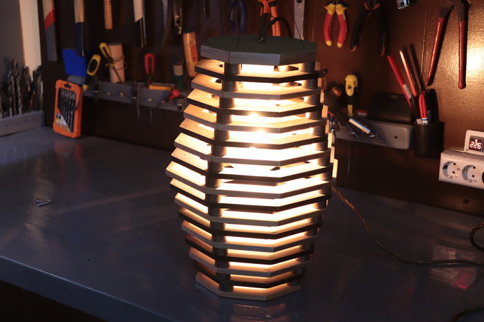 Работа заняла около трех с половиной часов. Материалы: обрезки сосновых реек ширина 32мм, толщина 10мм . Краска каричневая, золотой металлик и люминисцентный лак. Наружние размеры ребер восьмиугольников 70мм, 75мм, 80мм, 85мм, 90мм, 95мм, 100мм, 105мм, 110мм. Угол 22,5 градуса. Потрон Е27. Лампа декоротивная 5w. Все процесс смотрите на видео.