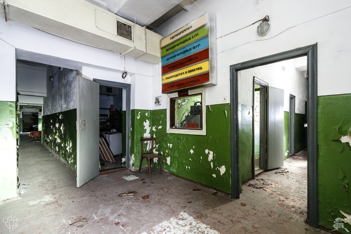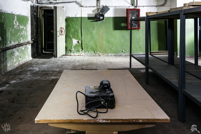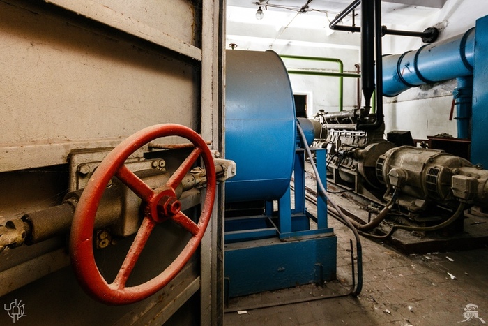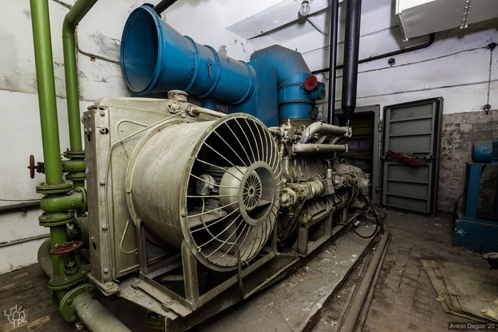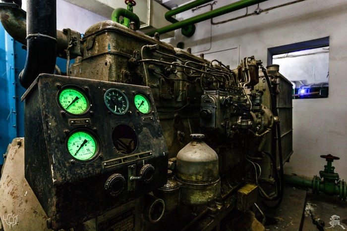Данная дизель-генераторная установка является типовой для подобных защитных сооружений гражданской обороны, но она все равно смотрится крайне симпатично в общей атмосфере царящей разрухи. Абсолютно целые и нетронутые внутренние и внешние составляющие, — хоть сейчас запускай.. Щиток с контрольно-измерительными приборами, обеспечивающими автоматическую остановку агрегата при повышении температуры охлаждающей воды и масла симпатично мигает, вымазанный специальным составом СПД (светомассы постоянного действия), реагирующей на источник света.