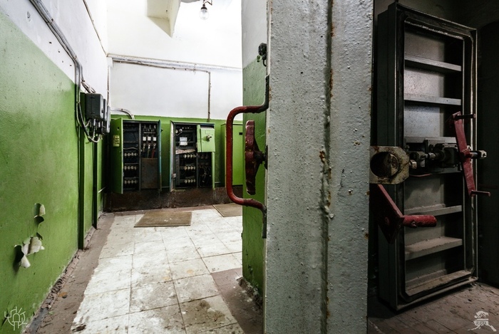 Позади отсека ДЭС располагается электрощитовая. Мы встретили её первой, но интереснее сперва было показать именно дизель. Одной из особенной таких технических помещений в убежищах является то, что они всегда изолированы от общих жилых помещений на расстоянии, а так же, на входе установлены защитно-герметичные двери, а если проще — «гермодвери». Сделано это по той причине, что такие установки крайне неустойчивы при постоянном функционировании, и могут даже буквально взорваться! А еще, в ДЭС обязательно имеются дополнительные баки запаса бензина и масла, что способствует еще большей взрывоопасности.