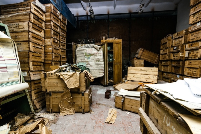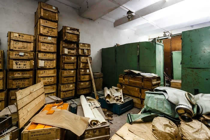 Пройдя в совсем иную часть укрытия, мы замечаем деревянную покосившуюся дверь, с многообещающей табличкой: «Склад». После нескольких минут в попытке зайти, дверь нехотя и со скрипом, но все же отворяется. Чего тут только нет! Целый сборник разнообразных средств индивидуальном защиты: от фильтрующих, до полностью изолирующих от внешней среды противогазов, индивидуальные аптечки, плакаты, дозиметры, прорезиненные костюмы, всего и не перечислишь.