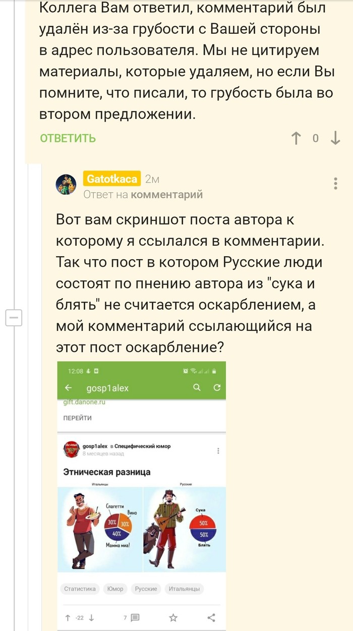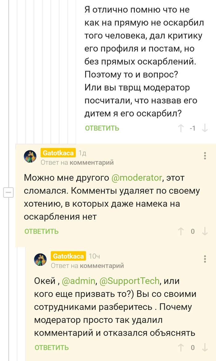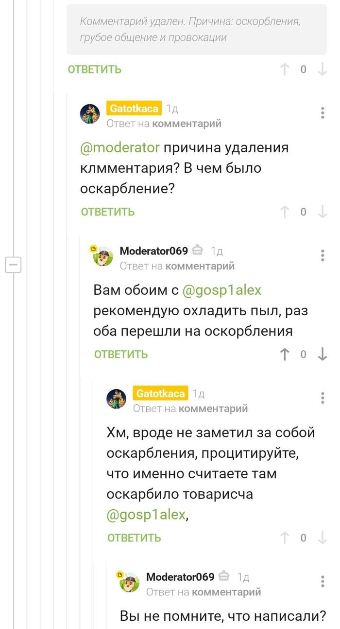 Просто как по мне уже смешная, но дико глупая история с @Moderator069, который увидел оскорбления пользователя в комментарии, где я указал посты этого пользователя. Скажите @gosp1alex, что же вас так обидело то? И объясните где было оскорбление?