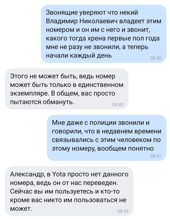 Больше полугода как приобрёл себе симкарту yota, перешел от них к другому оператору и не чувствовал проблем, пока последнюю неделю меня не стали доставать постоянные звонки от полиции и просто людей. Все звонящие утверждают что номер принадлежит другому человеку и они по этому номеру всегда с ним связываются и этот номер у них и записан в телефоне. Yota ситуацию прояснить не смогла, но быть может в комментариях найдется знающий человек?