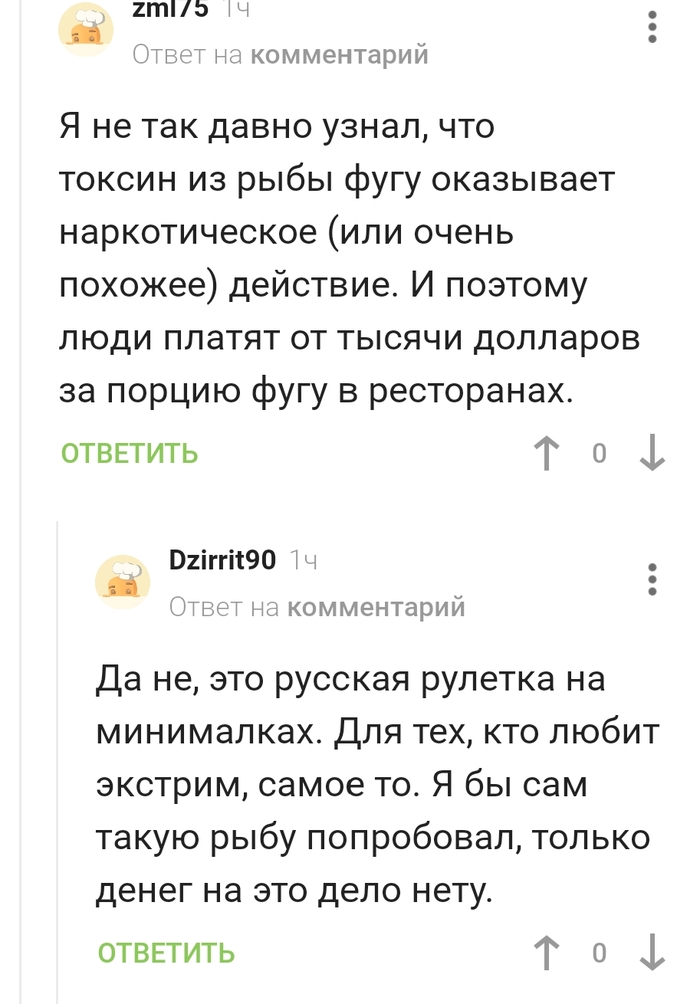 Фугу, прошу прощения, ее печень, содержит в себе яд тетродоксин. Вырабатывает его естественным образом, даже в неволе умудряется как-то, как ни странно. Яд сей опаснее кураре в хуйнадцать раз, что тоже надо иметь в виду. Вызывает остановку дыхания, затем летальный исход. Никаких наркотических эффектов за ним не замечено! Все, что вы получите, сожрав печень с ядом — реанимация и аппарат искусственного дыхания, пока яд не выйдет из организма. Или, если не повезет, путешествие на радугу, хотя тут кому как. Может, миру и повезет. Нет, блядь, нельзя сожрать кусок, поймать кайф, подождать и съесть ещё. Это не так работает, учитывая, что признаки отравления проявляются через десять минут, а если обыватель не мнителен, он их заметит, только когда перестанет дышать. Если едите саму рыбу, а не печень, опасности, по большому счету, нет. Однако, если вы будущий претендент на премию Дарвина, можете и рискнуть. И сука, блядь, нахуй, я, быть может, душнила, зануда, технически табуретка — но кайфа не было, нет и не будет! Просто вымораживает от таких гениальных заявлений. Есть подозрение, что эти люди ещё и антиваксеры. Ну а хули, "читал же где-то". И в теории заговора верят.