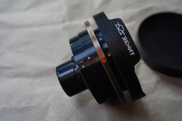 для этого нужно прокрутить бронзовое кольцо в направлении указаном стрелкой, пока линзоблок не углубится до момента, когда направляющие выйдут из зацепления с алюминиевым кольцом.