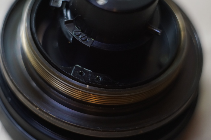 Далее откручивается назад до того момента пока направляющие не совпадут с ближайшими пазами в кольце. И в таком положении удерживая за корпус линзоблока и алюминиевое кольцо прокручивать бронзовое кольцо пока направляющие зайдут в пазы, Необходимо прогнать геликоид туда сюда, и после того как ясно что направляющие ходят в пазах плавно и легко, можно затянуть крепеж направляющих.