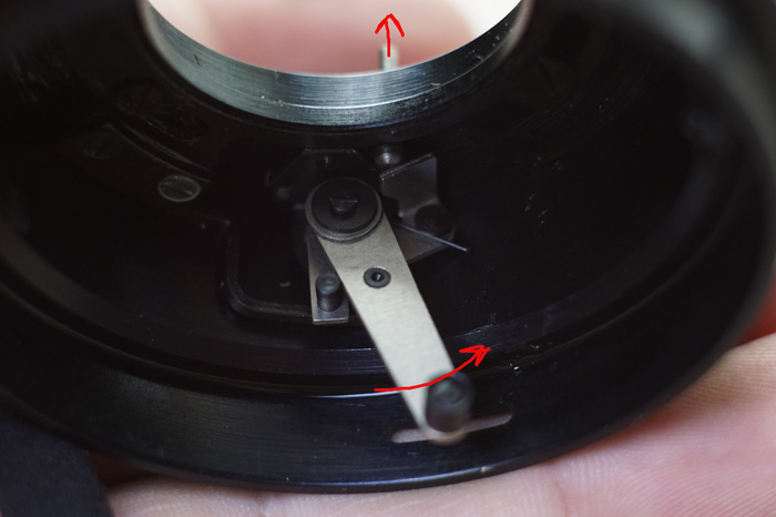 Затем нужно аккуратно одеть заднюю половинку на объектив следя за тем чтобы флажок с роликом был правее от ответного рычажка на линзоблоке, если смотреть со стороны задней линзы, а второй рычажок совпал со своим пазом, см фото