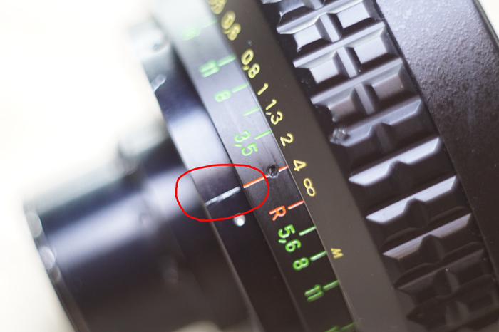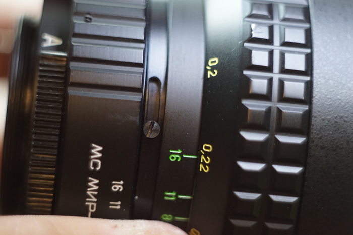 Далее устанавливается кольцо фокусировки, кольцо шкалы ГРИП по метке, и берем заднюю половинку с механизмом привода диафрагмы, и устанавливаем флажок в до конца вправо как на фото а пипка должна быть высунута.