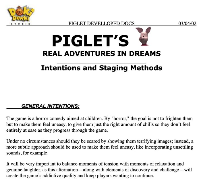 После того как были обнаружены схожести с "Resident Evil" и "Silent Hill", Piglet's Big Game (Большая Игра Пятачка) стала хитом в тематических блогах и игровых комьюнити. В этой игре наш герой, Пятачок, отправляется в приключение, чтобы победить свои страхи. Игра действительно напоминает упомянутые проекты классики хоррор-жанра: фиксированная камера, специфическое звуковое оформление. И, как оказалось, эти сходства не случайны.