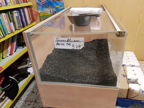 Семечки есть как в пакетиках, так и на развес. В кадр попала и небольшая полка с книгами. В основном там стоят классики, детские книги и донцова с компанией. Конечно есть учебники и словари немецкого.