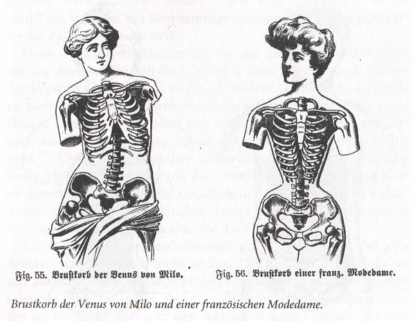 У замужней горожанки того времени платье зависело от времени дня и ее конкретного занятия. Помимо того к разным случаям и разным покроям платья полагались корсеты разной формы. Можно предположить, что затянутость корсета менялась в течении дня. Но доподлинно не известно, как же туго они зашнуровывались. Зато есть наглядны изображения, показывающие изменения в женском теле после длительного использования этой детали гардероба. Слева изображена грудная клетка Венеры Милосской, а справа - французской модницы.