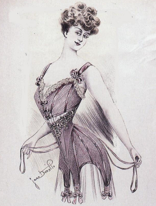 В то же время корсет удлинялся, постепенно закрывая бедра и корректируя их форму. В 90-х годах начали утягивать живот, придавая женскому силуэту S-образную форму, при которой подчеркивалась попа.