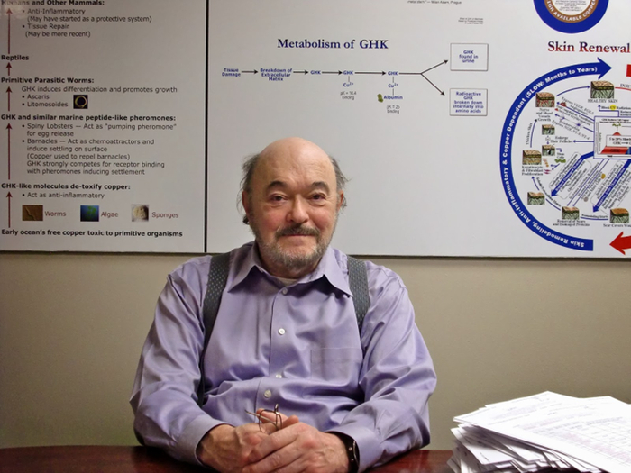 Дальше обнаружилось вот что: у двадцатилетних GHK в крови около 200 нг/мл, к шестидесяти годам остаётся 80 нг/мл. И это падение коррелирует с замедлением заживления ран, потерей упругости кожи и общим увяданием.