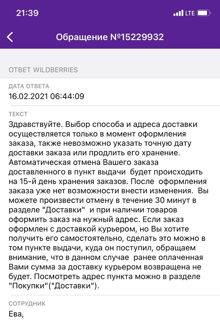 Поэтому следующее обращение я написала всё в той же теме «доставка товаров» + написала письмо им на электронную почту. Старалась делать всё оперативно, чтобы фактически доставка в неудобный ПВЗ еще не была осуществлена: