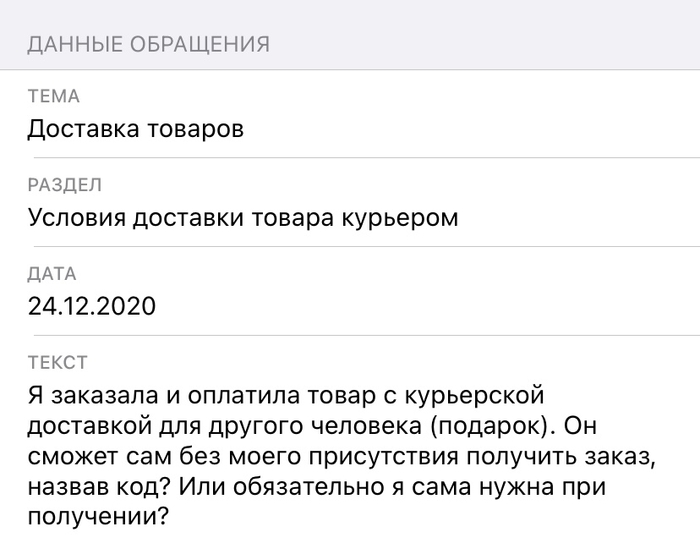 как видно, ответ на второй вопрос я получила через ЧЕТЫРЕ!! дня. К тому моменту заказ уже был получен моей мамой - у нее даже код не спросил курьер, только фамилию. Мама назвала свою (у нас разные), курьера этот вариант не устроил, тогда она назвала мою - и он отдал товар))