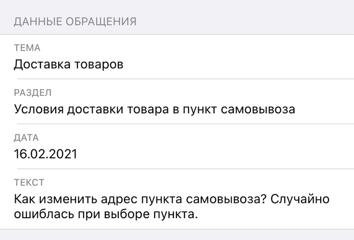 Когда заметила свой косяк, написала в службу поддержки, чтобы узнать, как изменить адрес пункта выдачи (вроде чисто физически это не должно быть сложно?).