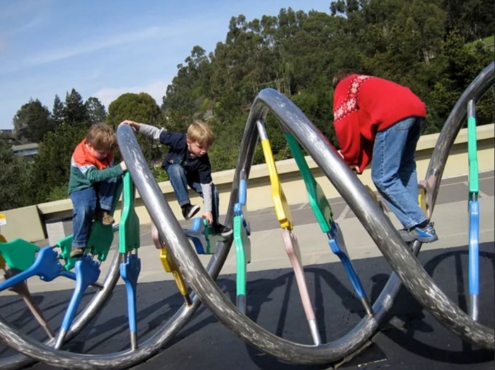 Автором композиции, установленной в 1992 году выступил известный калифорнийский дизайнер и архитектор Майкл Янцен. Причем, известен он в основном безумными проектами, типа вот этого. Так что композиция про ДНК - это он еще сдерживал себя. И все равно получилось довольно оригинально. Издалека она напоминает раму велосипеда, но на самом деле это художественная решетчатая лестница, по которой можно полазить.