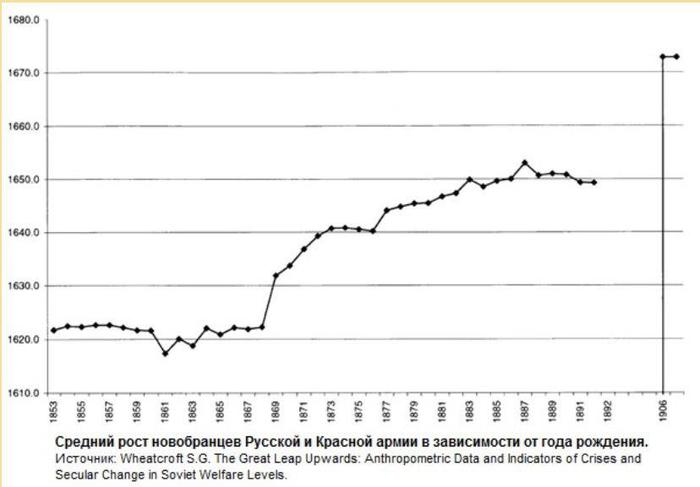 Потому что из этого графика, по мнению тех, кто его разместил, прямо рисуется картина, как после манифеста 19 февраля 1861 года у крестьян расправилась осанка и вытянулись вверх шеи. И я не смеюсь, рост показателей начинается в 1868 году, то есть, в том числе у призывников, родившихся и даже выросших при крепостном праве. Но даже, если вы в душе поэт и верите в такие перемены человеческого организма под благотворным влиянием освобождения, у меня для вас есть несколько "неудобных" моментов.