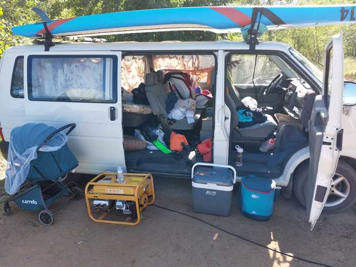 по мелочи докидали в машину пенки, мультиварку, генератор небольшой , паракорд, ножи, бутыли на 19 литров для питьевой воды, помпу для воды, игрушки детям на песке и в воду, стол + табуретки складные, две палатки со спальниками про запас.