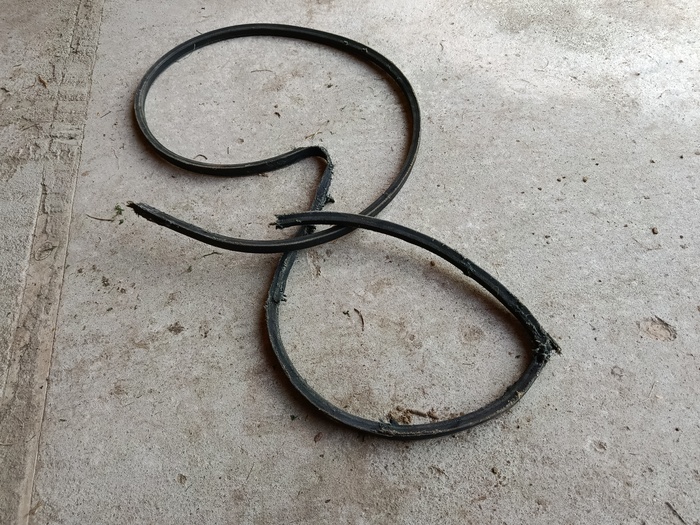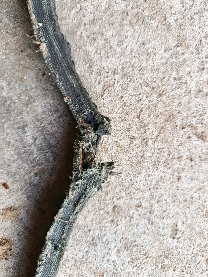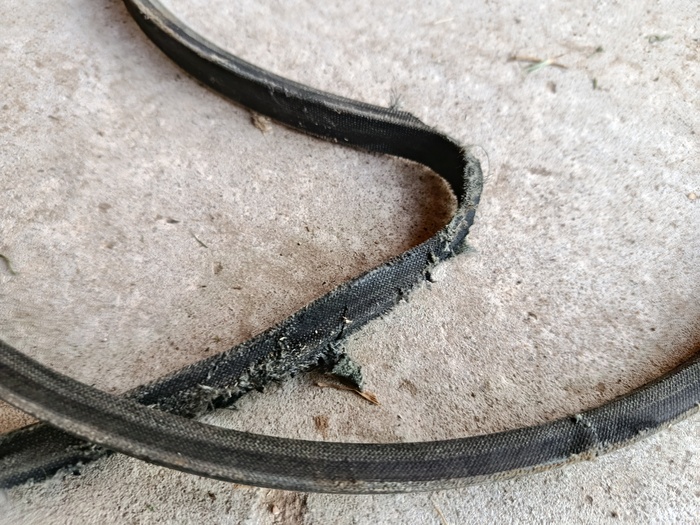 В этом году, во время сбора урожая, приключилась у меня беда - слетел ремень с картофелекопалки во время работы. Вот, вроде, ничего не поменялось с прошлого сезона, да и проверил всё, подтянул где надо, но всё равно слетел. Да и ладно бы просто слетел - его затянуло под приводные ремни от двигателя и жестко намотало на рычаг выжимного подшипника, при этом сломав его. Фото, как намотало, не делал, совсем не до этого было, а вот последствия для ремня сфоткал: