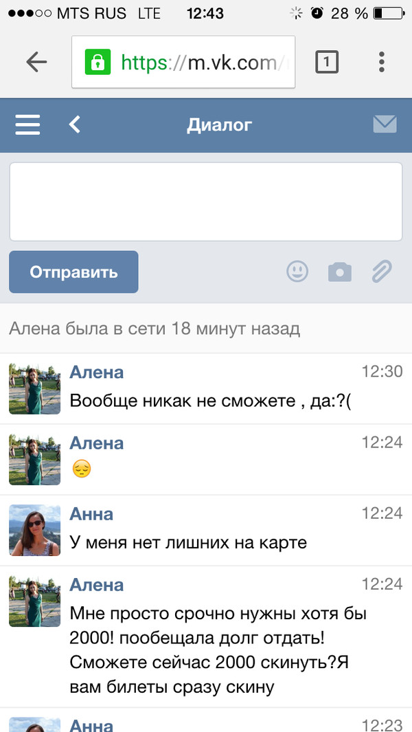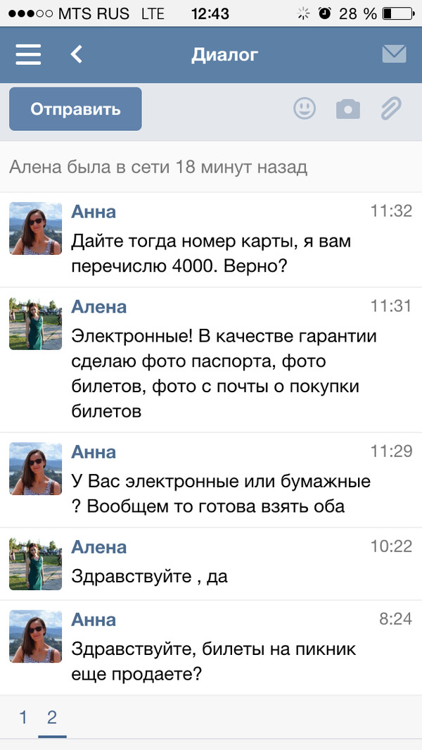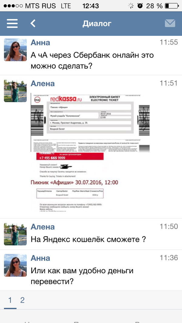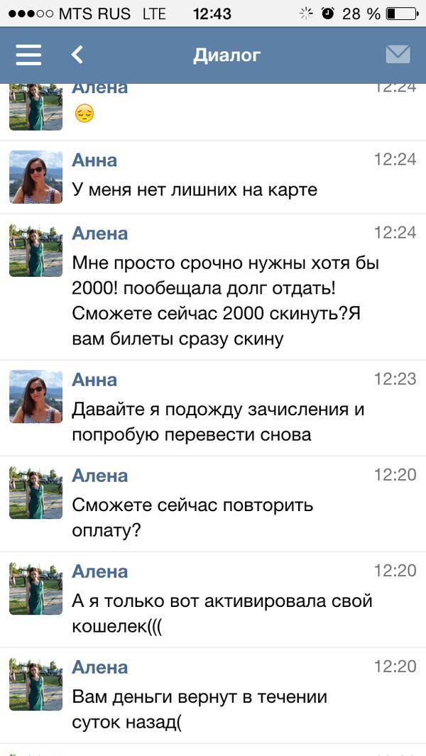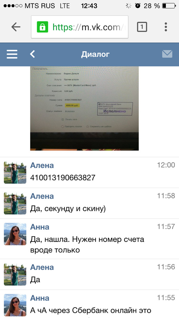 В одноименной группе в контакте, увидела объяву о продаже билетов на "пикник афиши". Девушка Алена попросила перечислить ей деньги на яндекс кошелек (4000р.), что я и сделала через сбербанк онлайн. Через 15 минут выяснилось что кошелек у нее якобы неактивирован и денежки мне вернуться на карту в течении суток. А далее просьбы закинуть хотя бы пару тыщщенок, долги раздать. Ну тут здравый смысл наконец-то ко мне пришел и я позвонила в яндекс. деньги где меня и огорчили, что мои кровные до нее дошли и после переписки с поддержкой выяснилось что и потрачены. История не нова, но так обидно. У кого-нибудь есть пример написания грамотного заявления в овд и вообще имеет ли смысл?