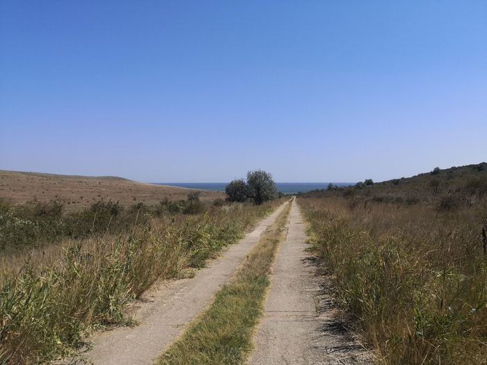 И... В общем-то дальше вдоль побережья дороги нет, только карабкаться обратно, либо экстремалить через сопки в сторону Курортного по давно заброшенным дорогам - крайне не советую. Я вот полез. Пробил оба колеса. Ехать по заросшей дороге, покрытой расселинами, очень неприятно, а в крутые горки пртходиься таскать вел на себе. Хорошо, что здесь постоянные порывы ветра с моря, не жарко, по крайней мере, хотя солнце и палит.