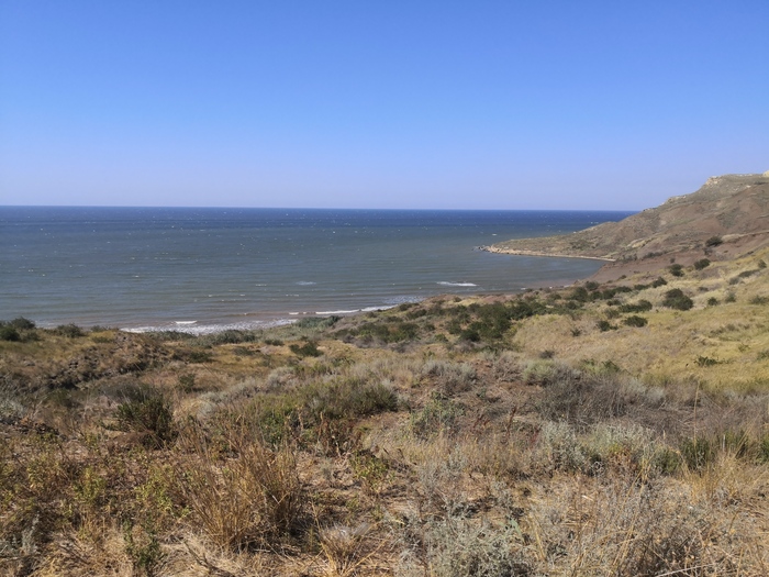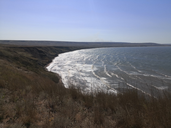 Азовское море тут очень тёплое, мелководье, но постоянная волна, каменистый вход, сильный тягун - в общем, не курорт. Пляжи песчаные, на них сегодня никого нет. Оно и понятно - спуститься сюда непросто, да и день будний. Мусор присутствует, в больших количествах.