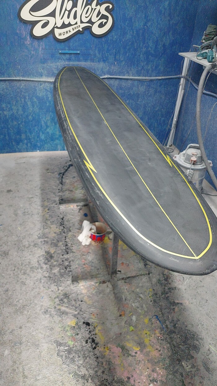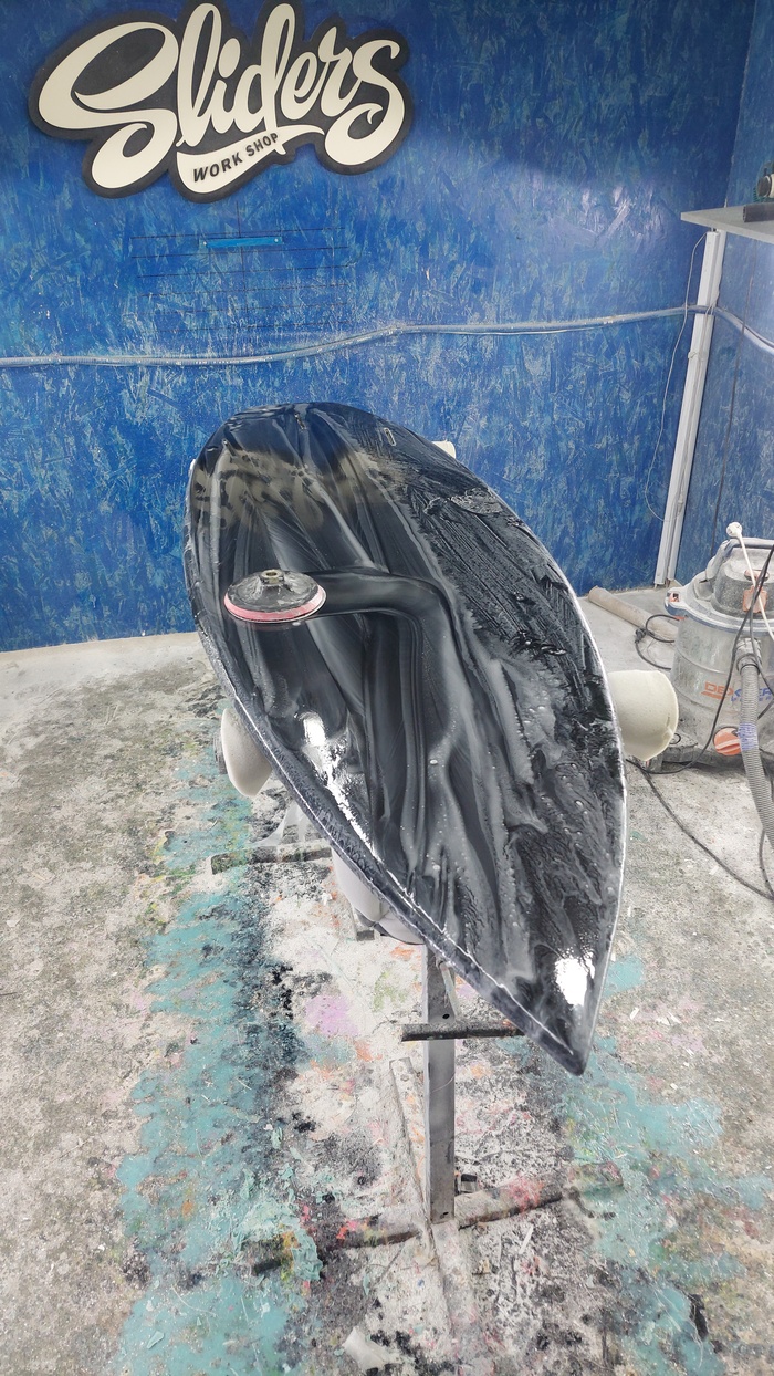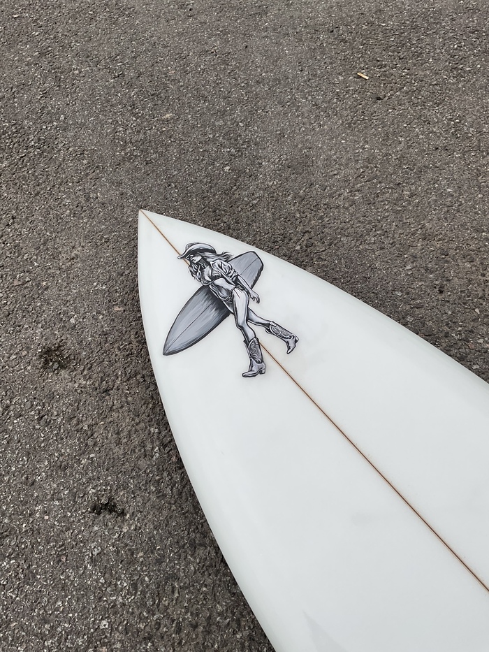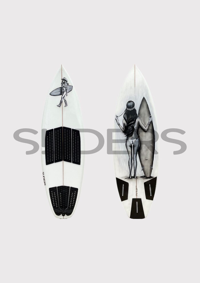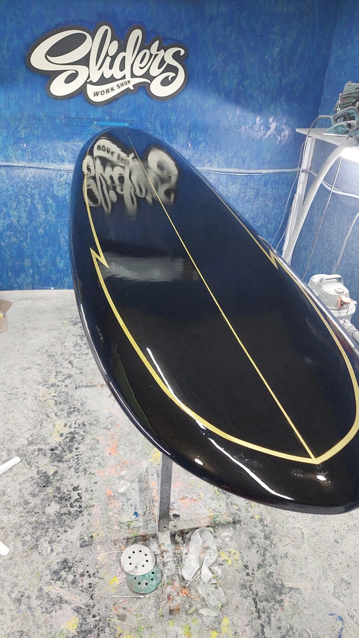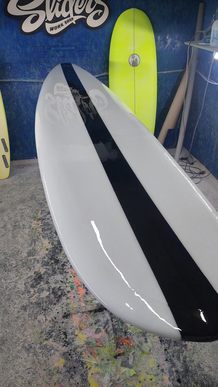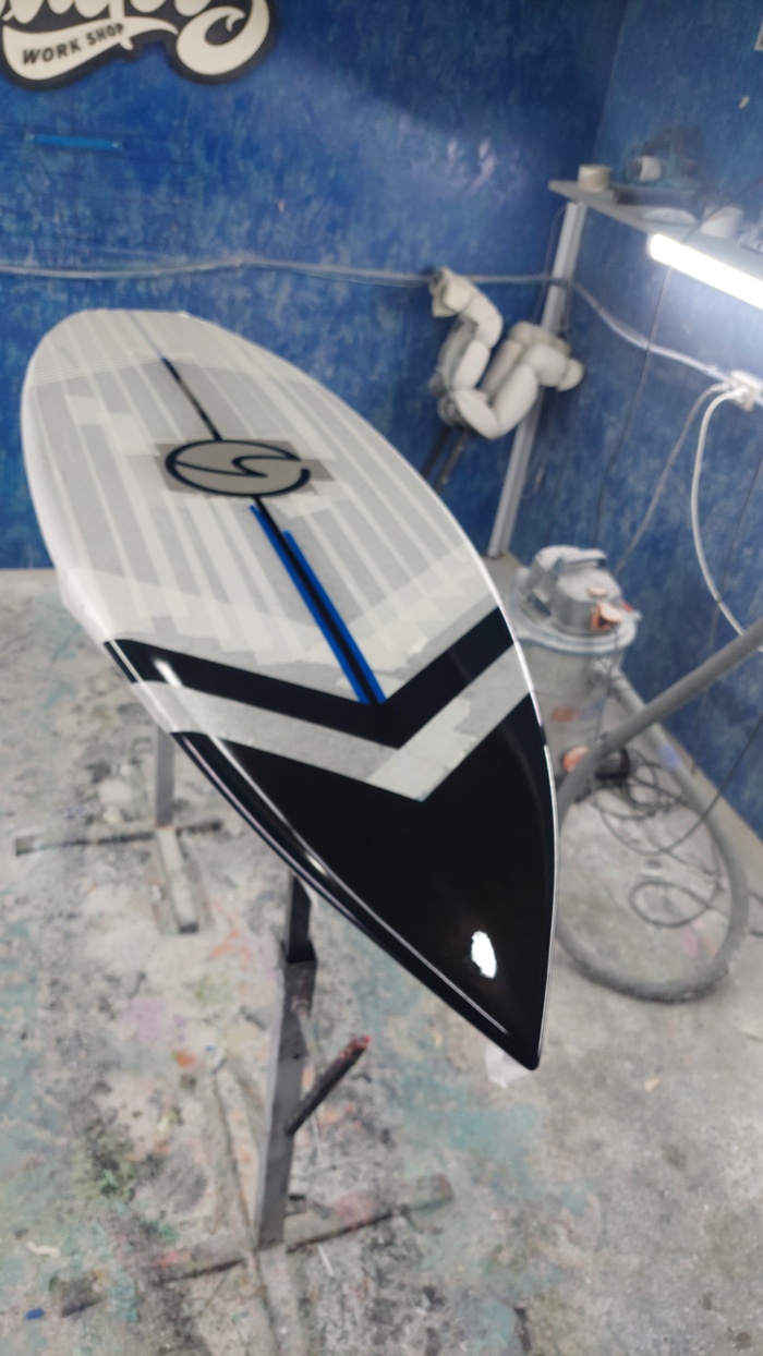 Основной цвет доски черный, сделан в технике Resin Tint, а именно смола перед нанесением на стеклоткань была колерована в чёрный цвет. Это особенно выделяет такие серф доски, т.к. технология более сложная и серфер эксплуатируя доску сможет не задумываться о царапинах на краске.