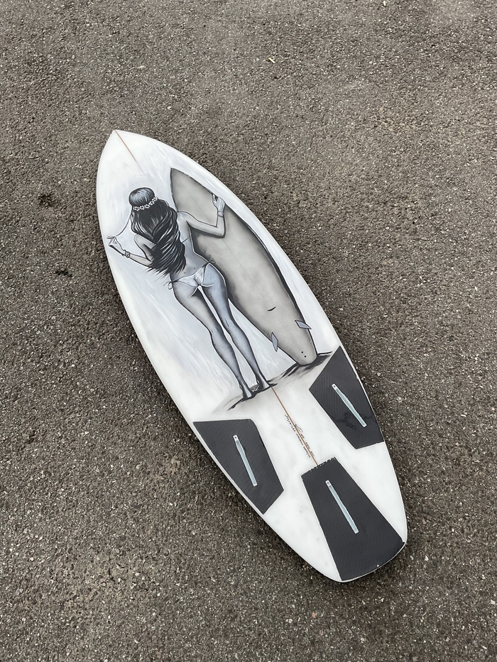 Вторая доска ещё более интересна тем, что усиления плавниковой системы выполнены карбоном. Также, полностью прозрачная работа. Иллюстрации выбраны заказчиком и выполнены акрилом под слоем смолы.