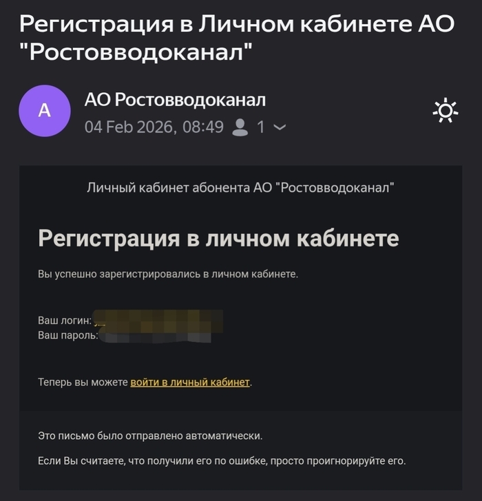 Регистрируюсь на сайте Ростовводоканала, ввожу пароль и тут же получаю письмо на почту с моим паролем, вот прям как есть, в незашифрованном виде. Моему негодованию нет предела.
