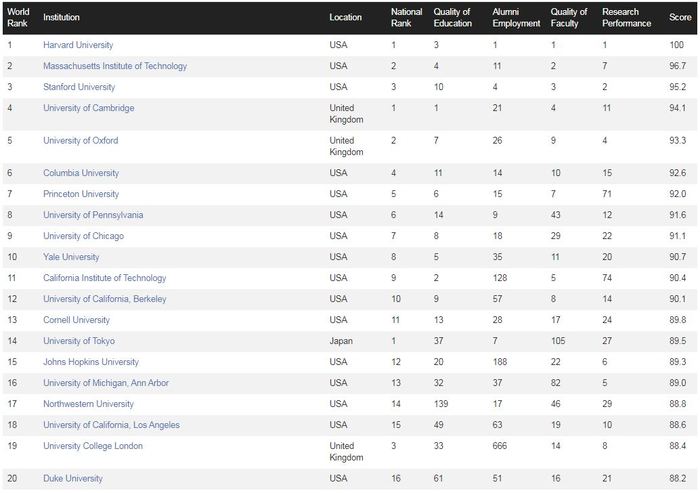Рейтинг двух тысяч лучших университетов мира по версии CWUR включает вузы 94 стран. Вузы оцениваются по качеству образования, востребованности выпускников на рынке труда, а также по научной деятельности.